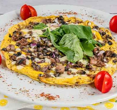 *Yumurta, Dana Kavurma, Rende Mozarella, Kırmızı Soğan, Mantar, Roka, Çeri Domates, Baharat ve Tereyağın Eşsiz Buluşması