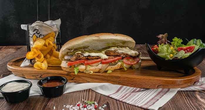 *Sandviç Ekmeğinde, Izgara Tavuk Göğüs, Iceberg Marul, Domates, Kornişon Turşu, Kaşar Peyniri ve Pesto Sos ile hazırlanır. Mini Salata, Kaşık Patates ve Türk Kahvesine Özel Soslar ile servis edilir.