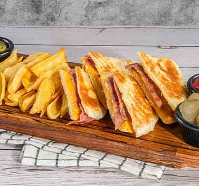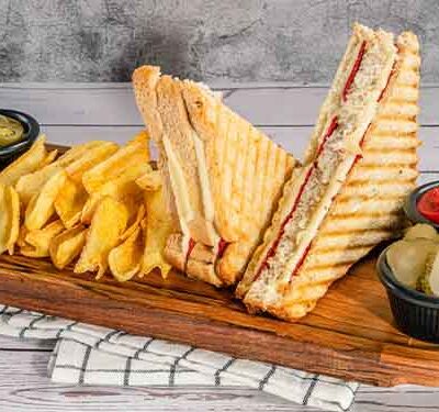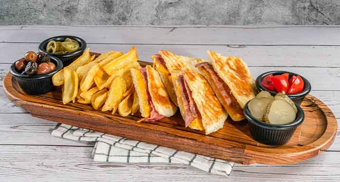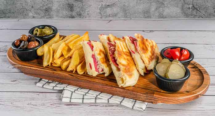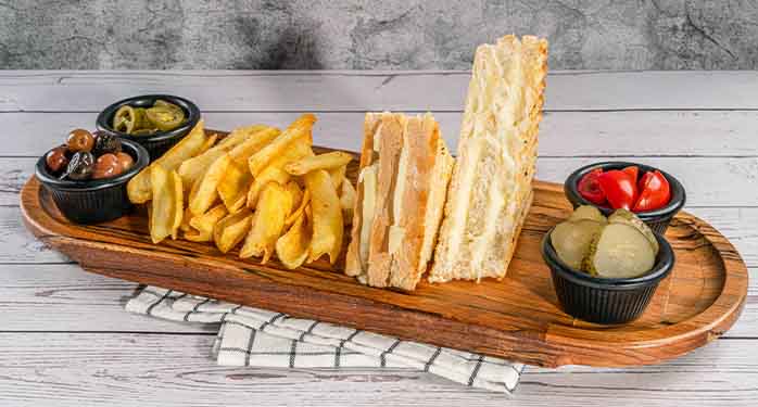 *3 Kat Tost Ekmeğinde, Kaşar Peyniri, Dana Sucuk, Kaşık Patates, Jalapone Biber, Çeri Domates, Salatalık, Kornişon Turşu, Zeytin ve Tereyağın Eşsiz Buluşması